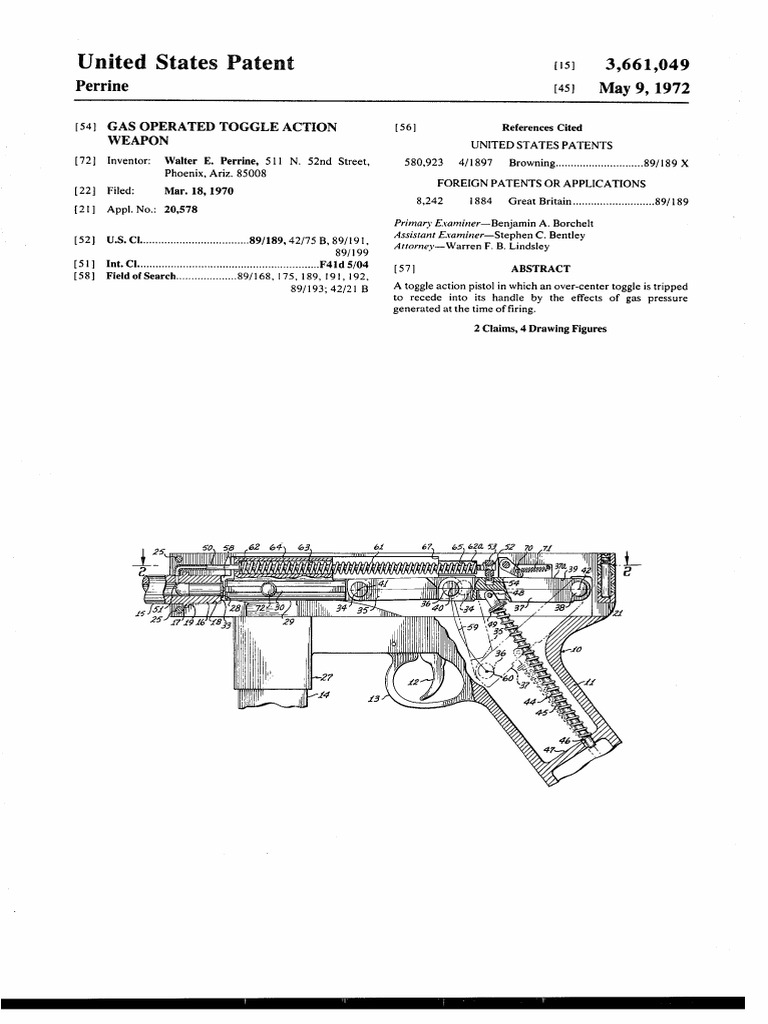 This invention pertains to toggle action weapons, and is par invention. For more details of the gun illustrated, reference is