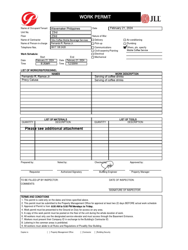 Name of Occupant/Tenant Wavemaker Philippines Date February 21, 2024