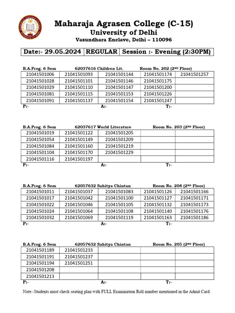Note:-Students must check seating plan with FULL Examination Roll number mentioned in the Admit Card.