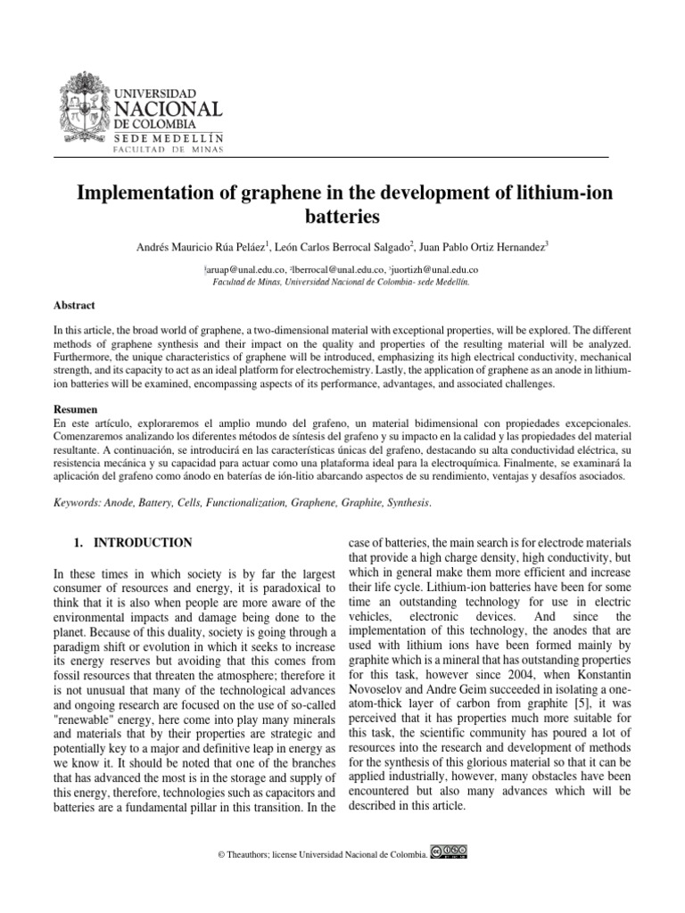 aplicación del grafeno como ánodo en baterías de ión-litio abarcando aspectos de su rendimiento, ventajas y desafíos asociados.
