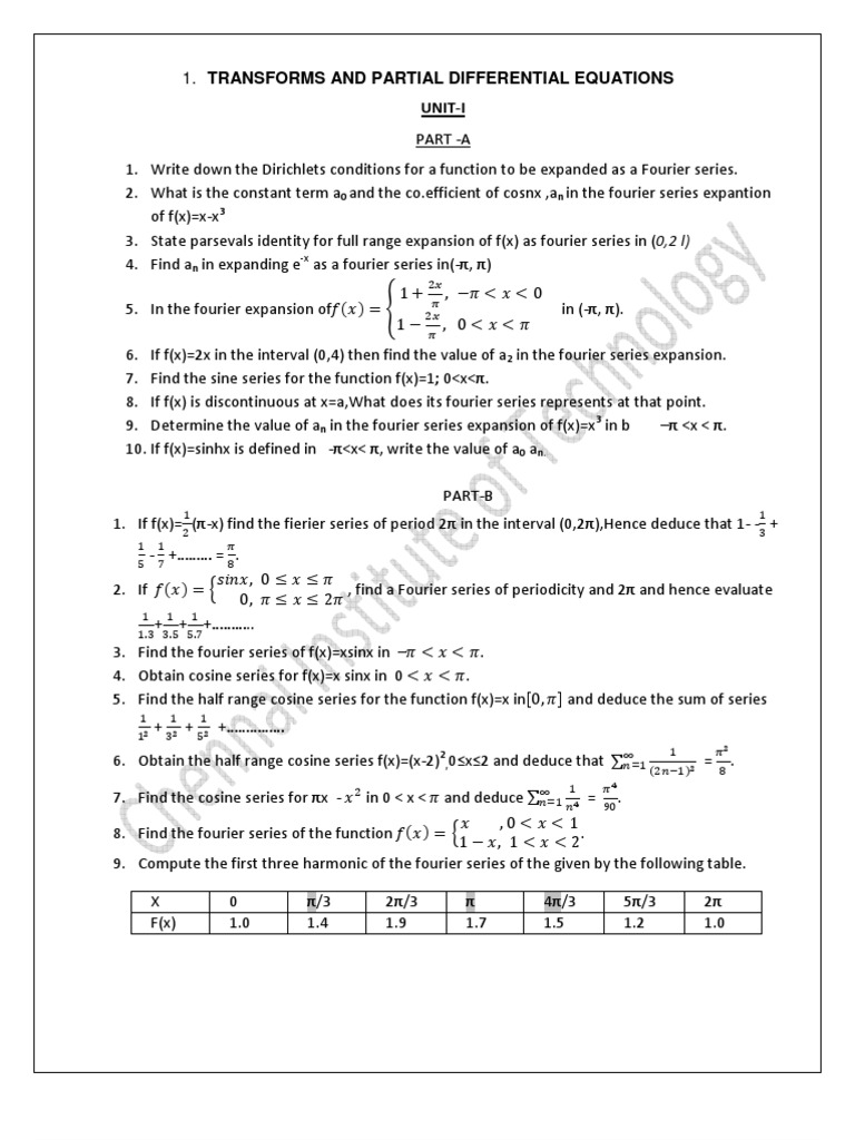 1. TRANSFORMS AND PARTIAL DIFFERENTIAL EQUATIONS UNIT-I PART -A 1.