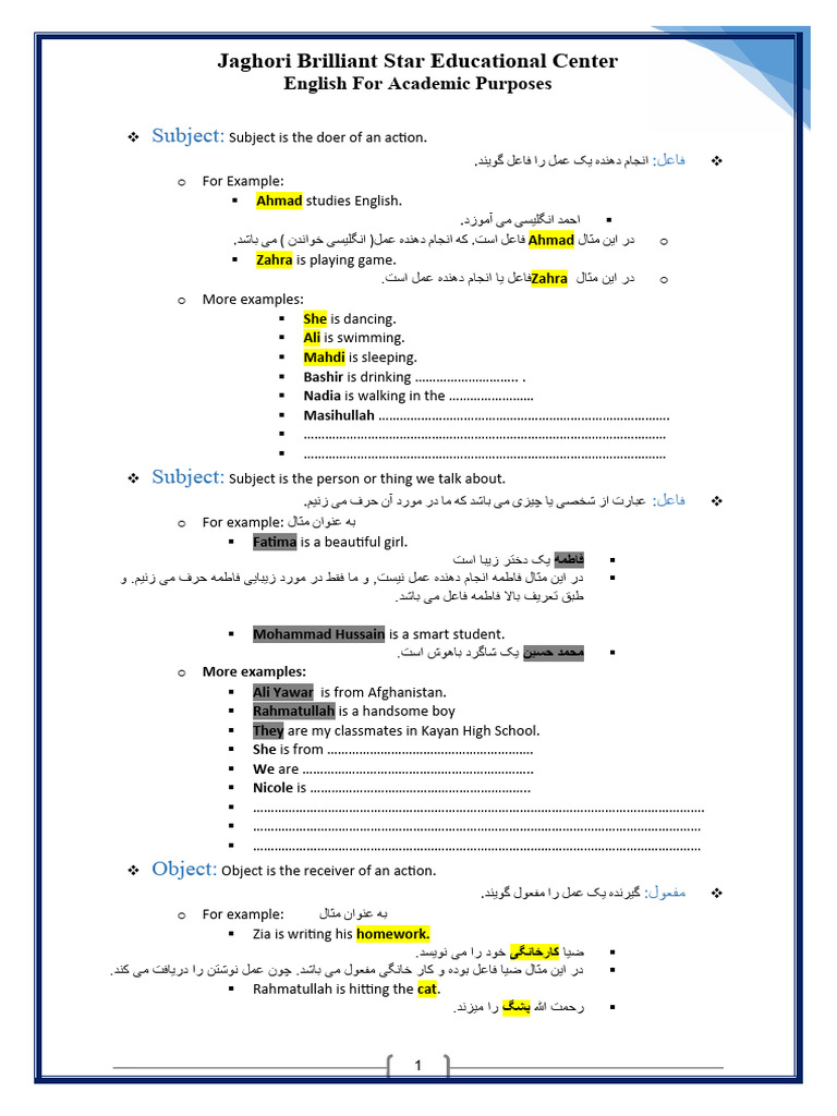 . که انجام دهنده عمل( انگلیسی خواندن ) می باشد. فاعل استAhmad در این مثال o
