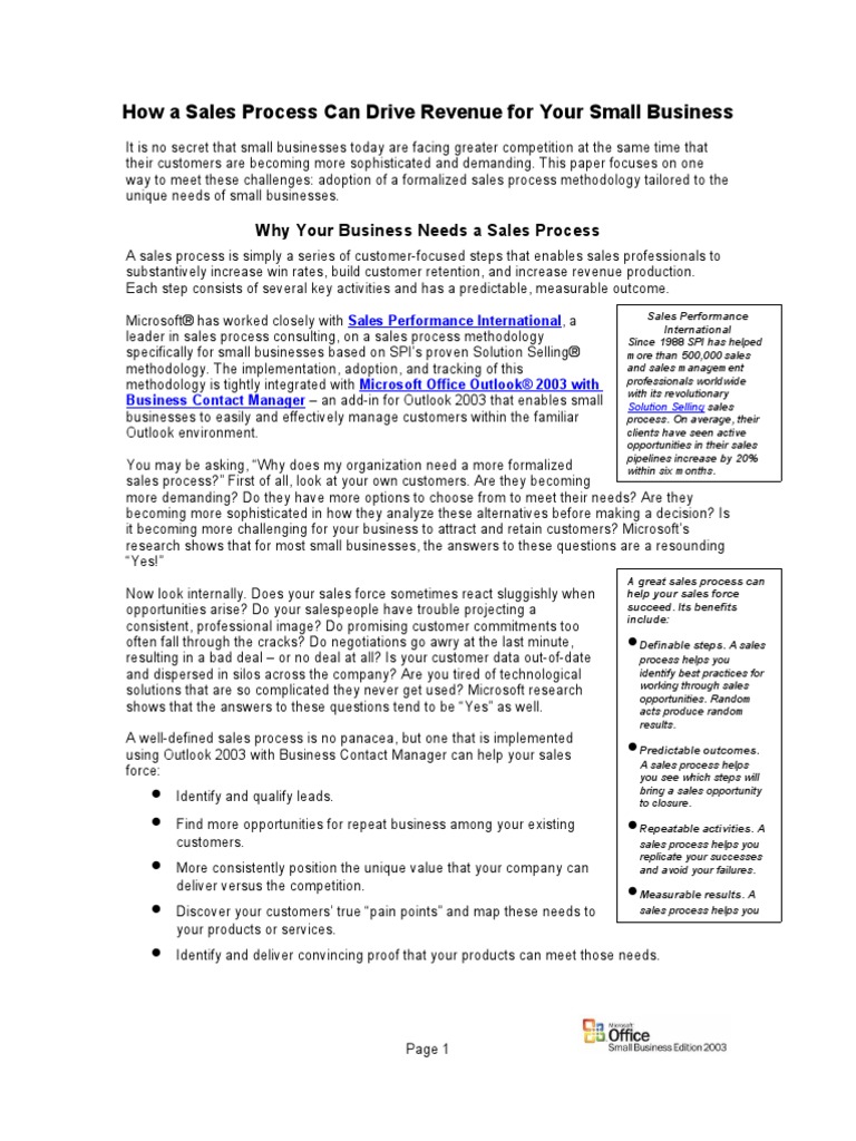 It is no secret that small businesses today are facing greater competition at the same time that their customers are becoming more sophisticated and demanding. This paper focuses on one way to meet these challenges: adoption of a formalized sales process methodology tailored to the unique needs of small businesses.
