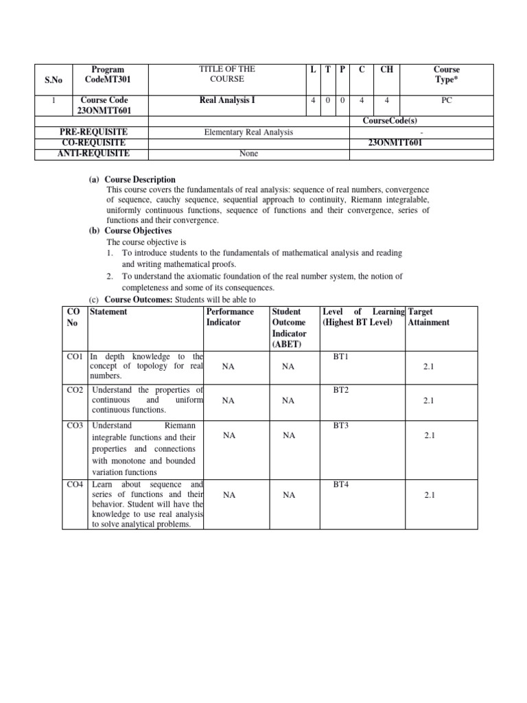 1 Course Code Real Analysis I 4 0 0 4 4 PC