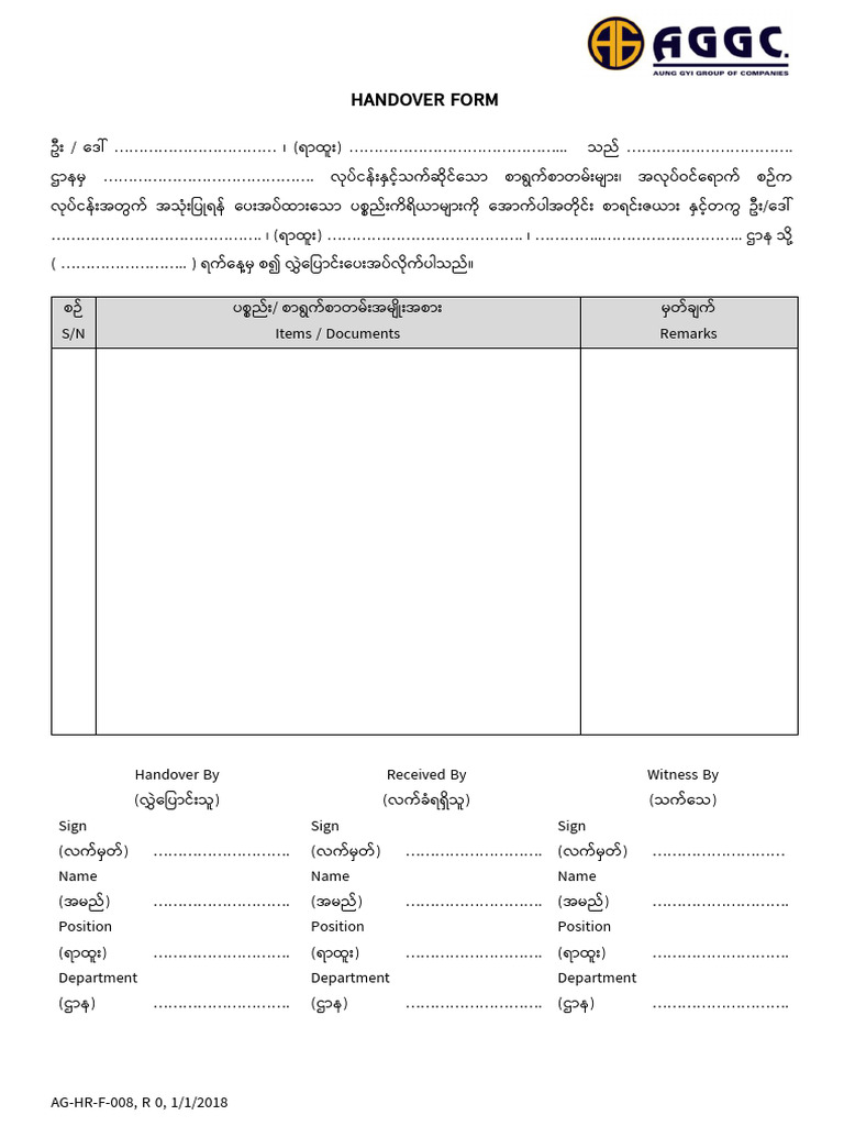 HANDOVER FORM