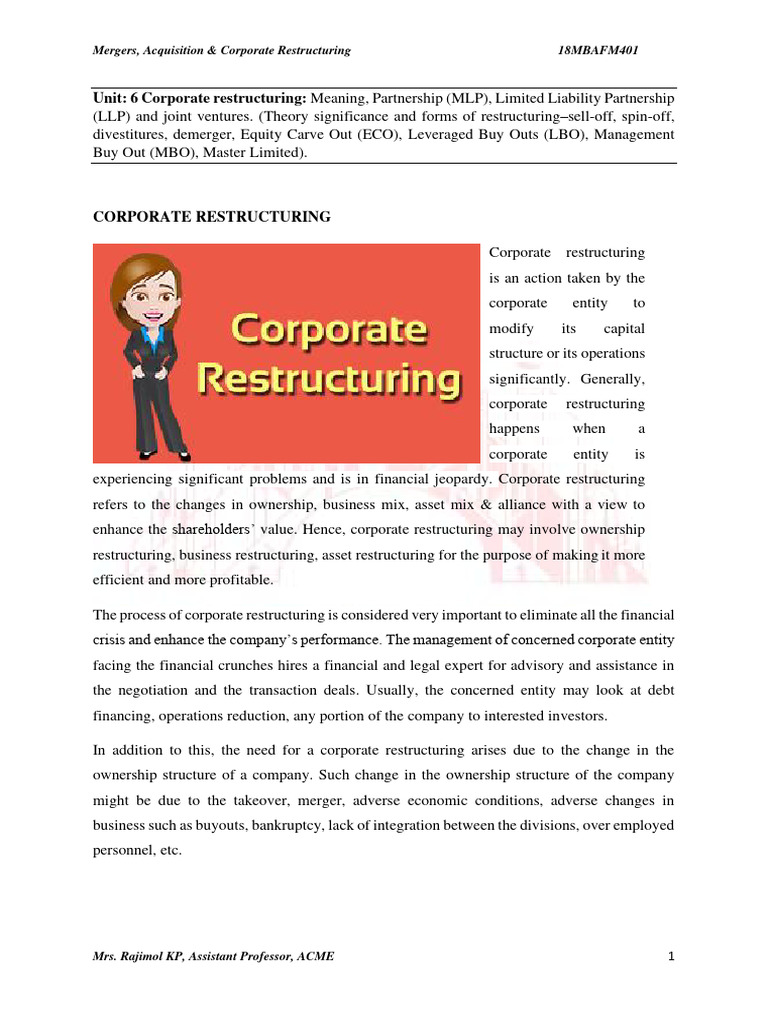 enhance the shareholders’ value. Hence, corporate restructuring may involve ownership