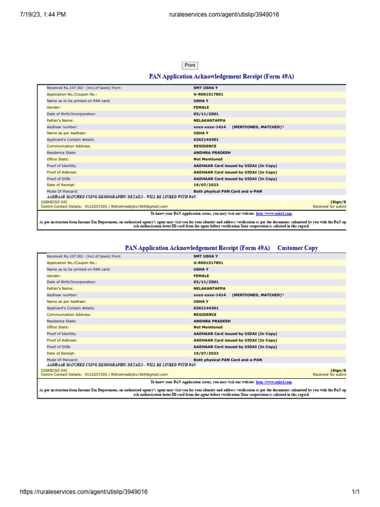 PAN Application Acknowledgement Receipt (Form 49A) Customer Copy