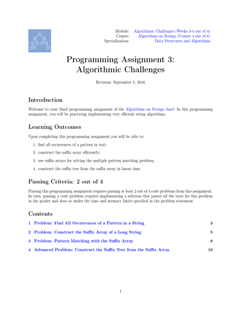 Welcome to your third programming assignment of the Algorithms on Strings class! In this programming