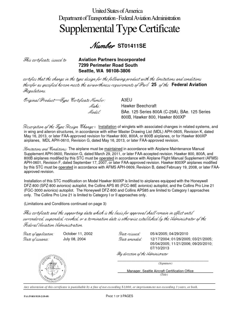 Installation of this STC modification on Model Hawker 800XP is limited to airplanes equipped with the Honeywell