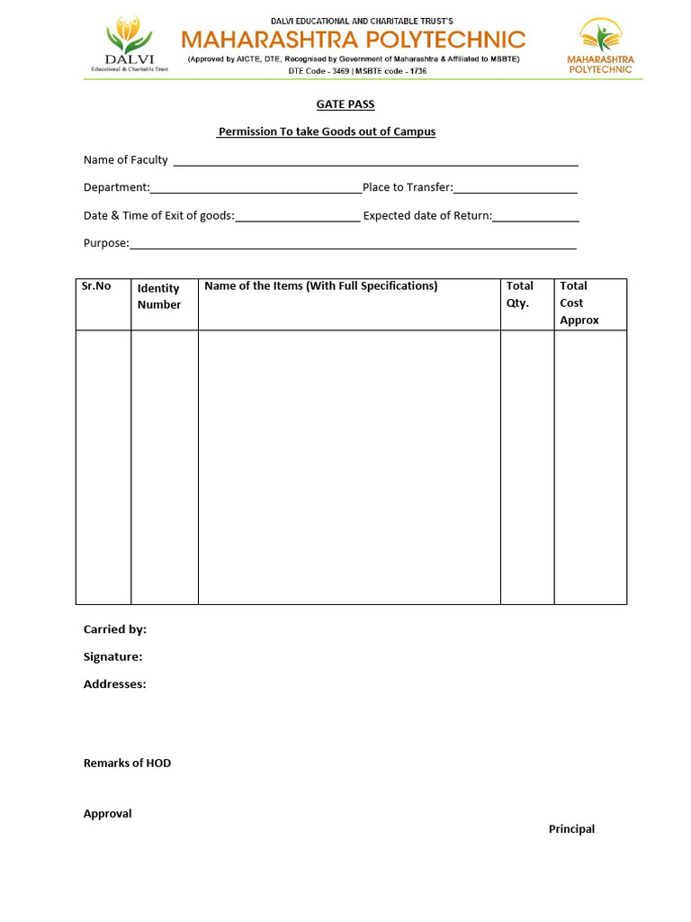 Permission To take Goods out of Campus