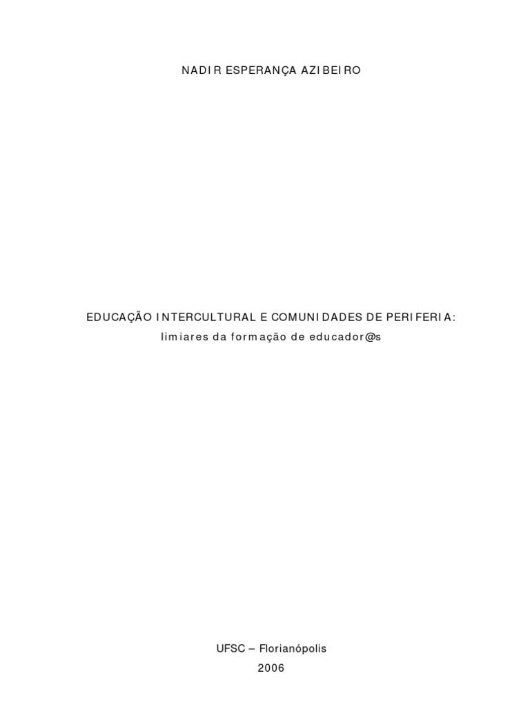ARROYO, Miguel G. Da escola carente escola possvel. So Paulo: Loyola, 1991. _____. Ofcio de Mestre: imagens e auto-imagens. Petrpolis, RJ: Vozes, 2000. _____. Imagens quebradas: trajetrias e tempos de alunos e mestres. Petrpolis, RJ: Vozes, 2004. ASSIS, Glucia de Oliveira. De Cricima para o mundo: rearranjos familiares e de gnero nas vivncias dos novos migrantes brasileiros. Tese de Doutorado. Campinas: UNICAMP, 2004. ASSMAN, Hugo. Reencantar a educao: rumo sociedade aprendente. Petrpolis, RJ: Vozes, 1998. ATHAYDE, Celso et allii. Cabea de porco. Rio de Janeiro: Objetiva, 2005. AURAS, Marli. Poder oligrquico catarinense: da guerra dos fanticos do contestado opo dos pequenos. Tese de Doutorado. PUC-SP, 1991. AZEVEDO, Fernando de. A cultura brasileira: introduo ao estudo da cultura no Brasil. 6ed.Rio de Janeiro: Ed. UFRJ ; Braslia: Ed. UnB, 1996. AZEVEDO, Jos Clvis. A escola cidad: desafios, dilogos e travessias. In: Utopia e democracia na educao cidad. Porto Alegre: Editora da UFGRS : Secretaria Municipal de Educao, 2000, p. 23-48. AZIBEIRO, Nadir Esperana. A Criao de Relaes de Saber, Poder e Prazer na Vida e nos Processos Educativos: a experincia do FFMP-INCA, 1, 2 e 3 turmas. Dissertao de Mestrado. Florianpolis: PPGE-UFSC, 1994. _____. Anlise das Metodologias de Interveno das Assessorias nas Comunidades de Periferia da Grande Florianpolis. Projeto de Pesquisa, aprovado para o Programa de Bolsas PROBICUDESC, fevereiro, 1998. _____. Corpo, Educao Intercultural e Cidadania. Projeto de Pesquisa, aprovado para o Programa de Bolsas PIBIC-CNPq, maro, 1999a. _____. Anlise das Metodologias de Interveno das Assessorias nas Comunidades de Periferia da Grande Florianpolis. Relatrio Final de Pesquisa. Florianpolis: FAED-UDESC, 1999b. _____. Movimentos Sociais, Paradigma da Complexidade e Intercultura. In: Congresso Virtual De Antropologia, Buenos Aires. Ciudad Virtual de Antropologia y Arqueologia, 2000. _____. Educao Popular e Movimentos Sociais: O que tm feito as assessorias? Trabalho apresentado na 24 Reunio Anual da ANPED, Caxambu, 2001a. _____. Comunidades na Fronteira: Nova Esperana e Santa Teresinha. Projeto de Pesquisa, aprovado para o Programa de Bolsas PROBIC-UDESC, fevereiro, 2001b. _____. Movimentos Sociais, Paradigma da Complexidade e Intercultura: algumas consideraes para discusso em sala-de-aula. Cadernos do NEPP, n 1. Florianpolis: FAEDUDESC, maio 2001c. _____. Corpo, Educao Intercultural Florianpolis: FAED-UDESC, 2001d. e Cidadania. Relatrio Final de Pesquisa.