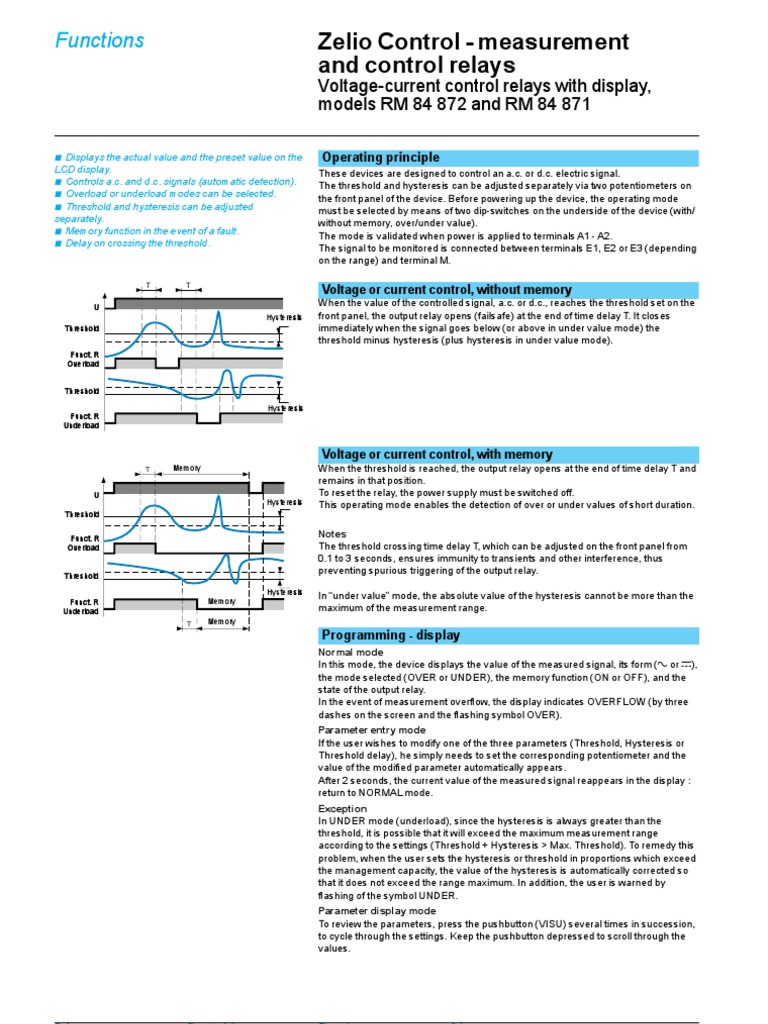 b Displays the actual value and the preset value on the LCD display. b Controls a.c. and d.c. signals (automatic detection). b Overload or underload modes can be selected. b Threshold and hysteresis can be adjusted separately. b Memory function in the event of a fault. b Delay on crossing the threshold.