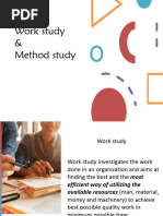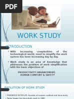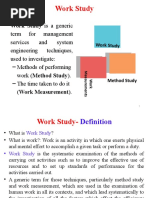 • Work study is simply the study of work. It is the analysis of work into smaller parts followed