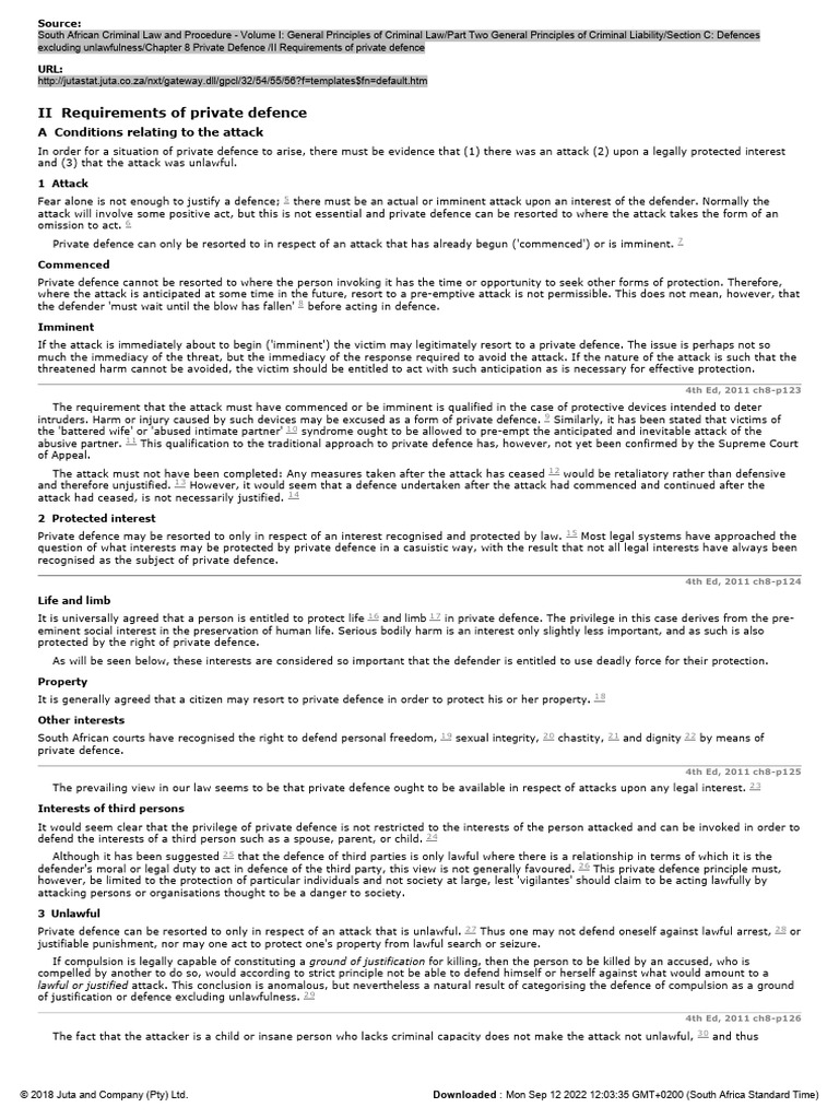 Private defence may be resorted to only in respect of an interest recognised and protected by law. 1 5 Most legal systems have approached the