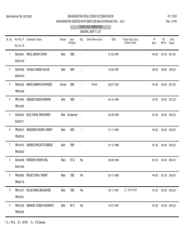 Sr. No. Roll No. P1 Candidates' Name Gender Appl. NCL Other Reservation DOB *Higher Edu. Qual. P1 P2 Total