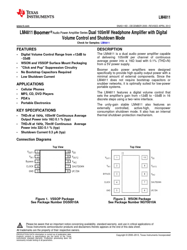 2• Digital Volume Control Range from +12dB to The LM4811 is a dual audio power amplifier capable