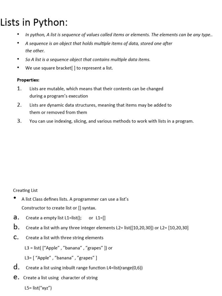 • In python, A list is sequence of values called items or elements. The elements can be any type..