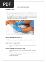 Monitor bowel sounds and aspirate residual before each Check patency of tube prior to feeding Remember: Height of container = 12 Temperature of OF = lukewarm Duration of Delivery = not <15minutes (to prevent abdominal cramping) clamp tube for 30 minutes if cramping occurs Complications of Gastroenteral Feedings either through NGT or PEG Dumping Syndrome (to prevent, low fowlers position 30mins post OF) Obstructed tubing Nausea and vomiting Tubing inadvertently pulled-out Diarrhea Aspiration Pneumonia Stoma and skin infection or breakdown Hyperglycemia INTESTINAL OSTOMIES Purposes: a.) Provides an alterative feeding route b.) Elimination of feces or urine Types: 1. Gastrostomy an opening through the abdominal wall into the stomach 2. Jejunostomy an opening through the abdominal wall into the jejunum 3. Ileostomy an opening in the ileum (small bowel) for draining fecal material *no irrigation needed, wet fecal material, appliance needed all the time, meticulous skin care is necessary to prevent skin breakdown; bag is emptied if it is half-full 4. Colostomy an opening in the colon (large bowel) for excreting feces * solid fecal material comes out; can be irrigated; can be bowel trained