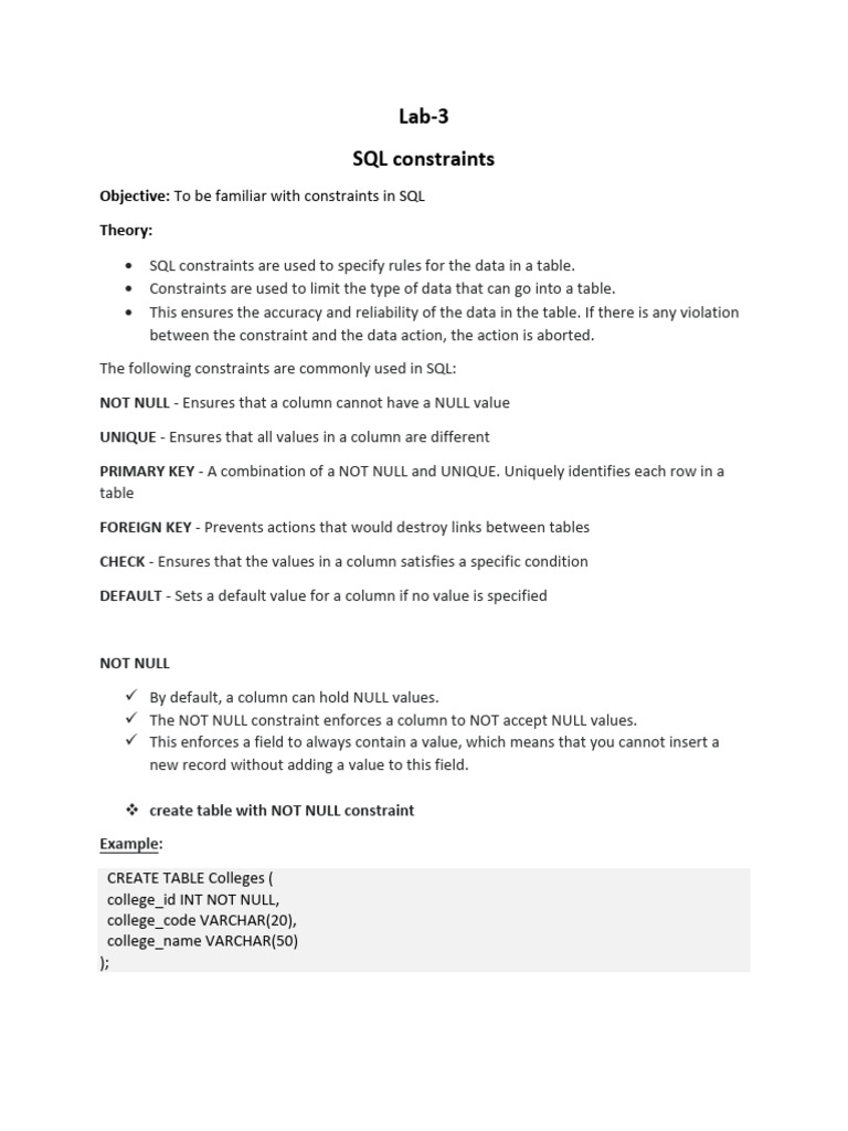 Objective: To be familiar with constraints in SQL
