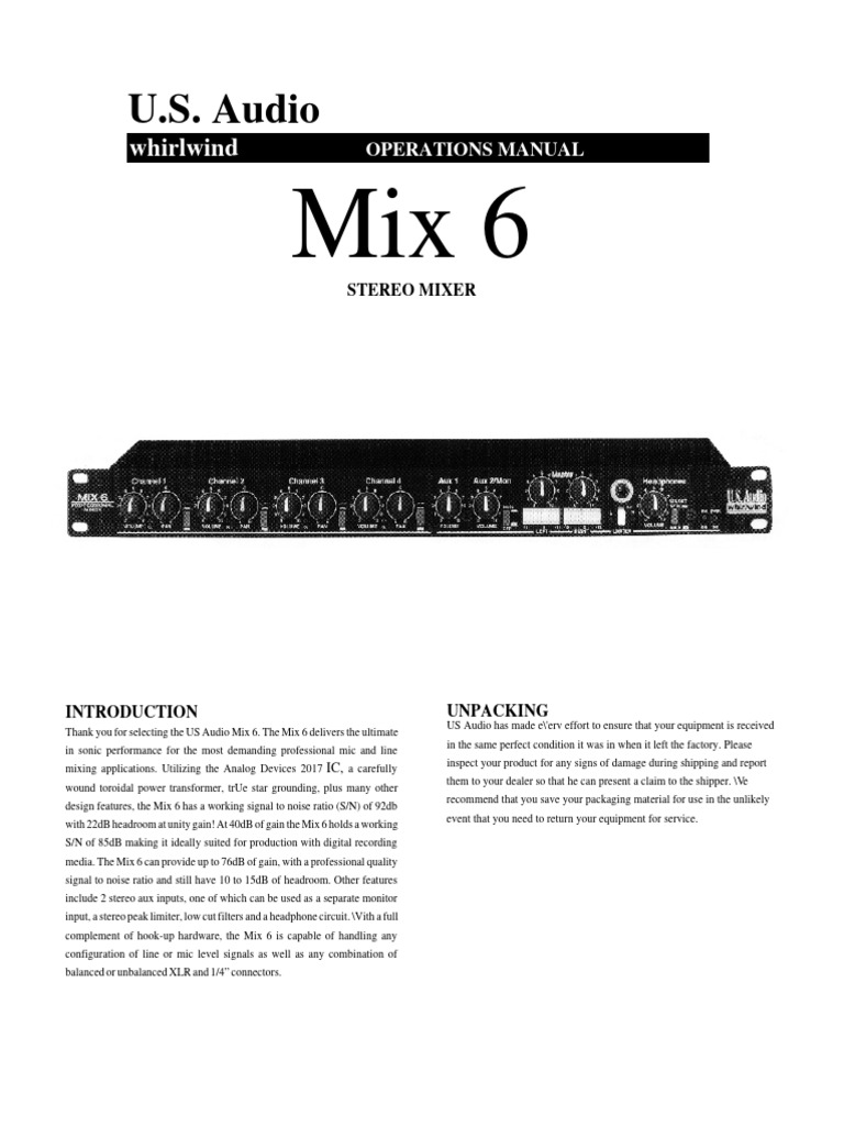 Thank you for selecting the US Audio Mix 6. The Mix 6 delivers the ultimate