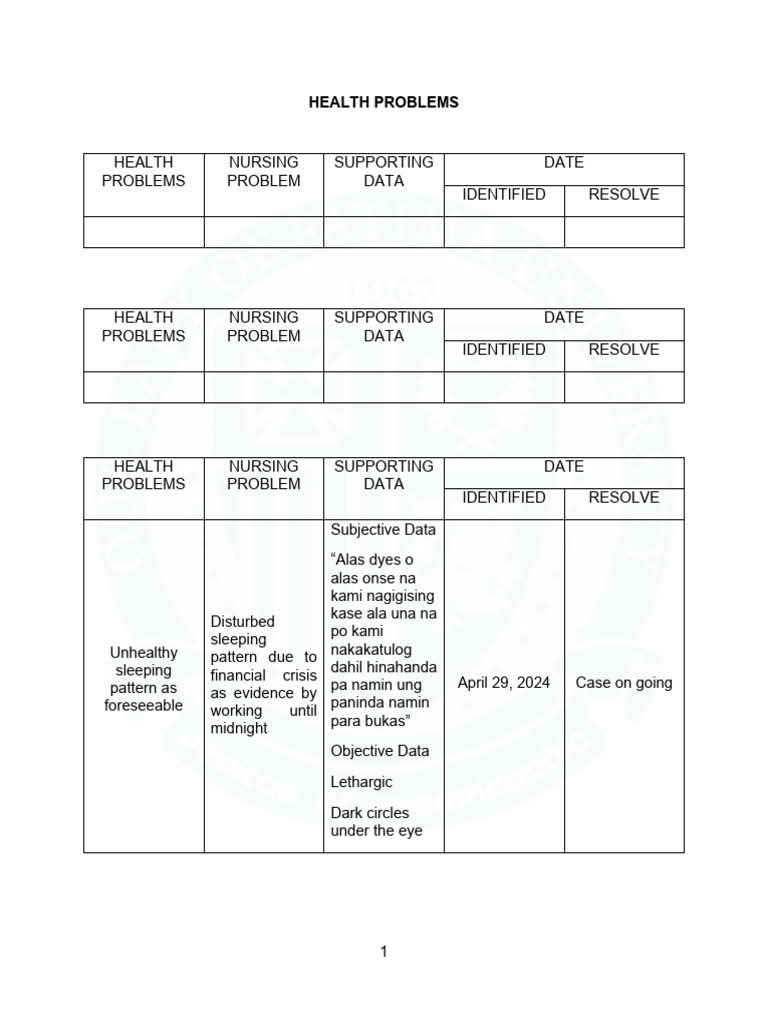 Direction: Within two days, list down the health problems recognized in each of the 10