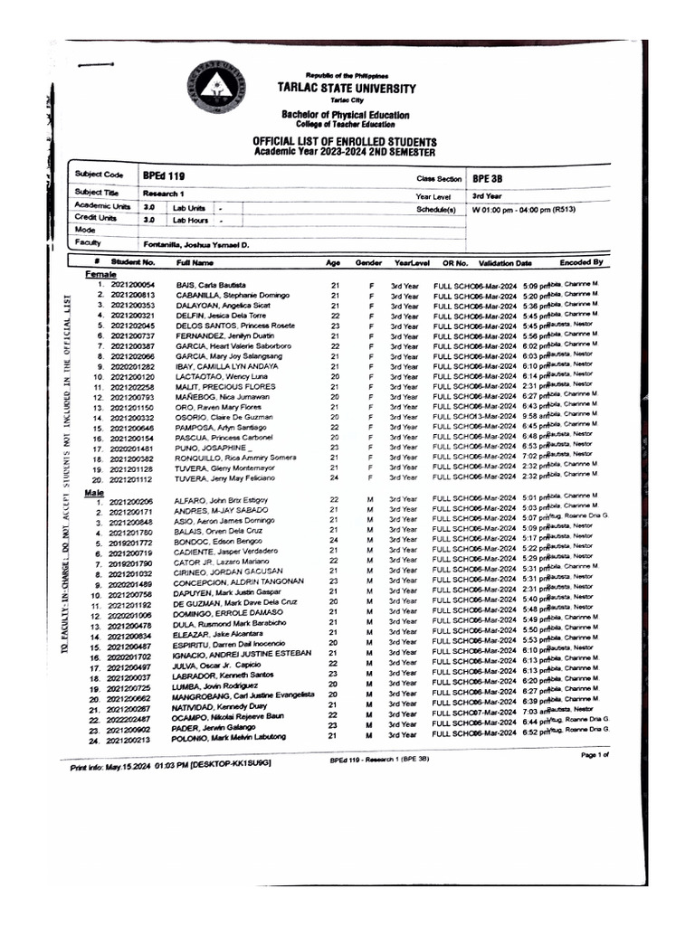 OFFICIAL LIST OF ENROLLED STUDENTS
