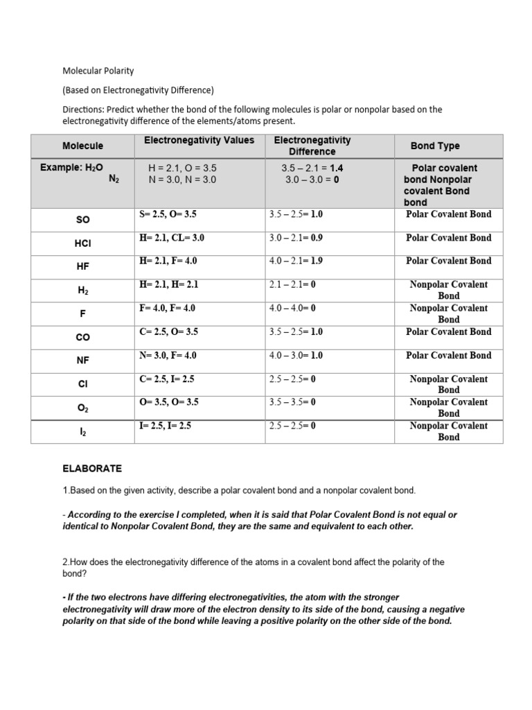 1.Based on the given activity, describe a polar covalent bond and a nonpolar covalent bond.