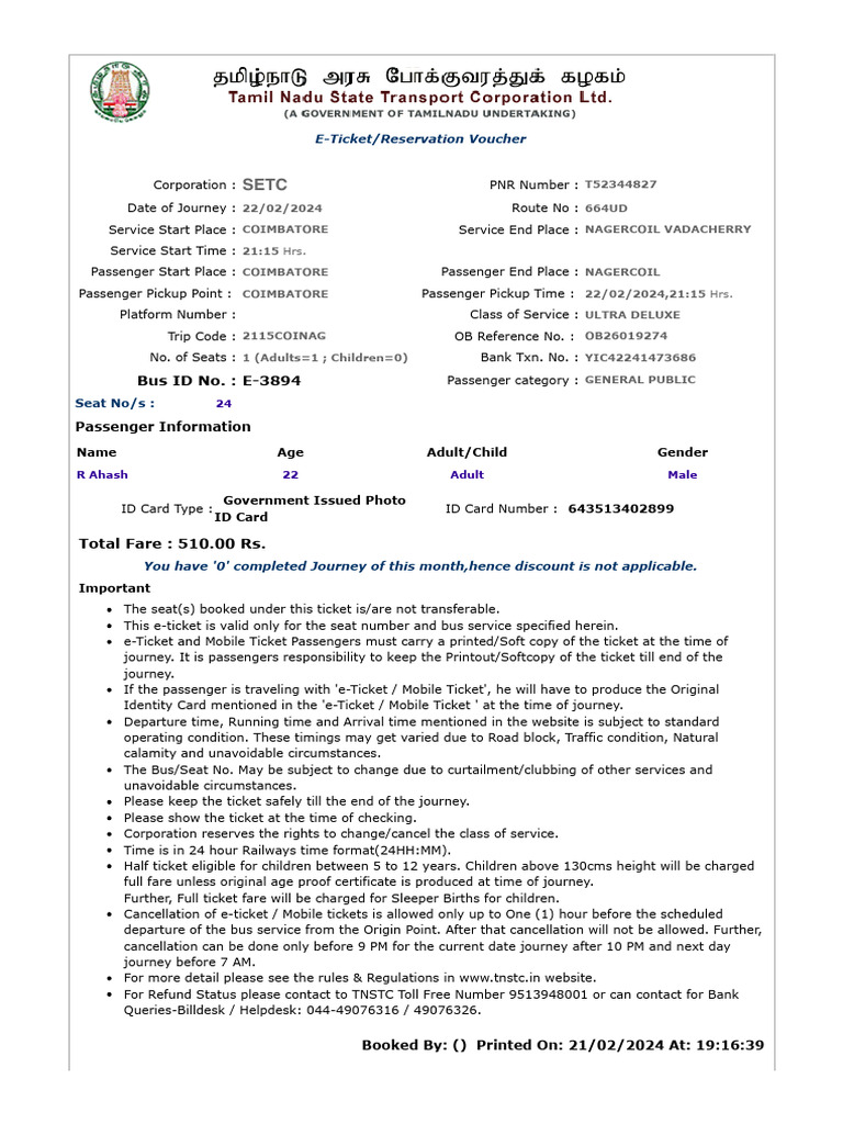 Passenger Pickup Point : COIMBATORE Passenger Pickup Time : 22/02/2024,21:15 Hrs.