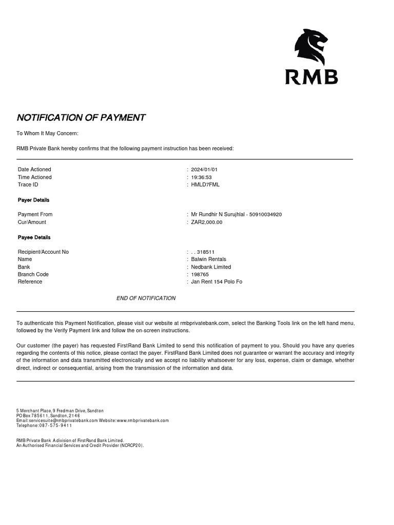 regarding the contents of this notice, please contact the payer. FirstRand Bank Limited does not guarantee or warrant the accuracy and integrity