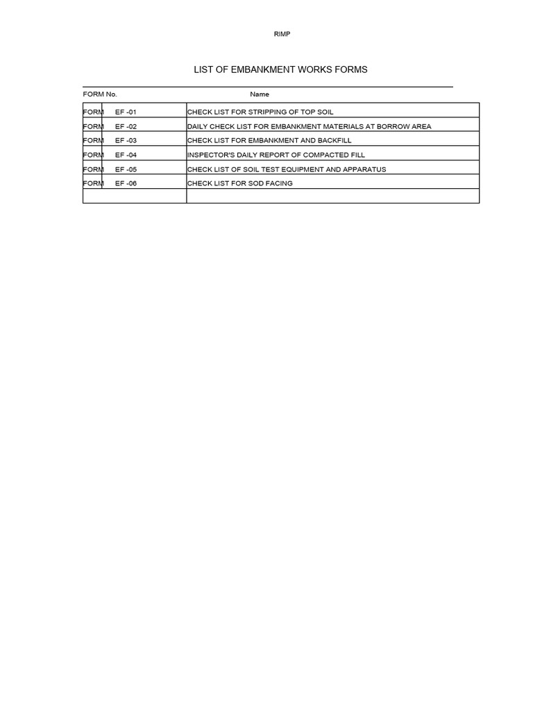 LIST OF EMBANKMENT WORKS FORMS