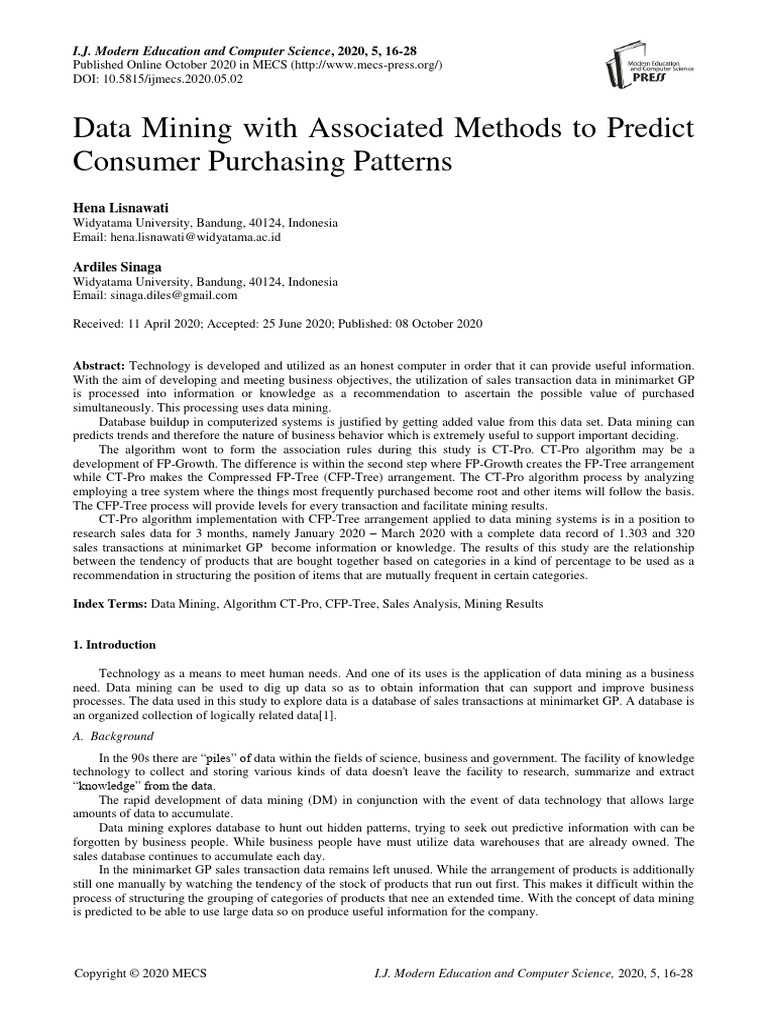 How to cite this paper: Hena Lisnawati, Ardiles Sinaga, " Data Mining with Associated Methods to Predict Consumer Purchasing