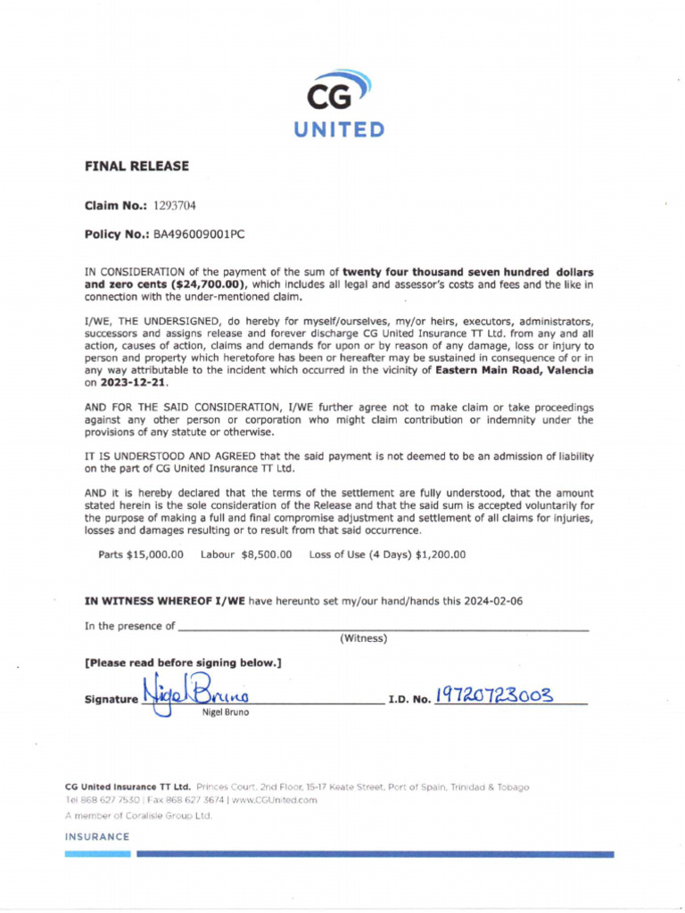 successors and assigns release and forever discharge CG United Insurance TT Ltd. from any and all