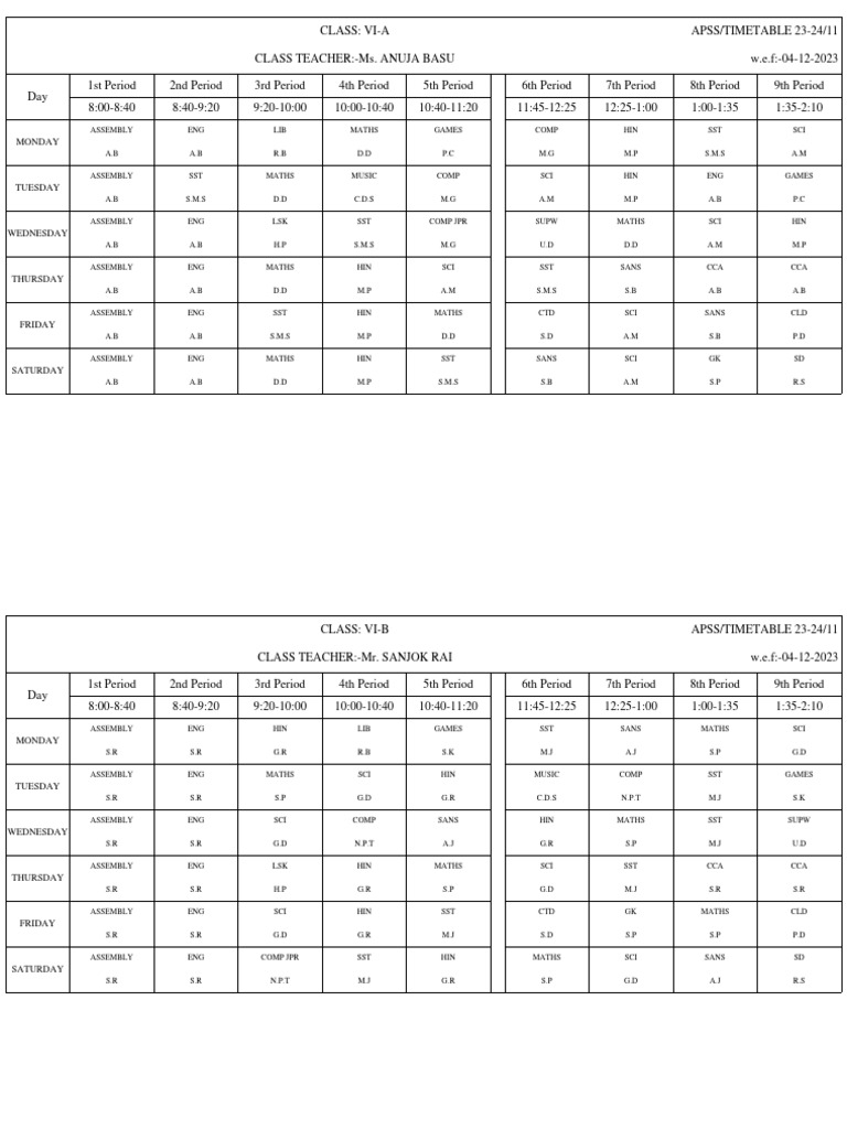 CLASS: VII-A APSS/TIMETABLE 23-24/11