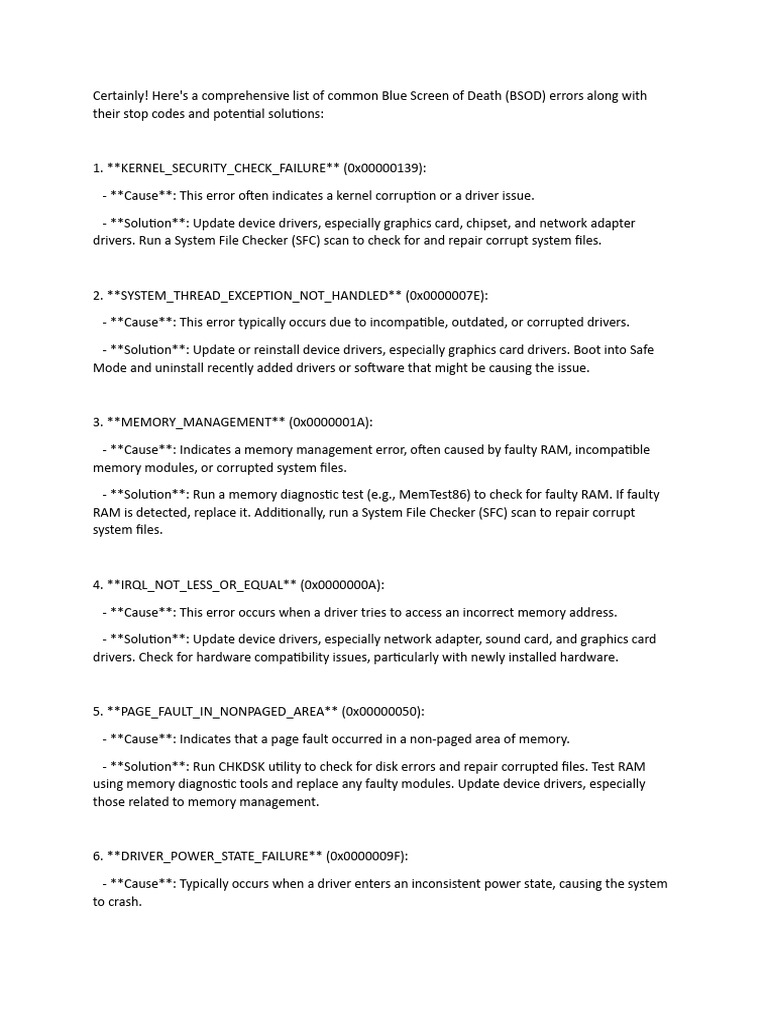 Here's a comprehensive list of common Blue Screen of Death (BSOD) errors along with