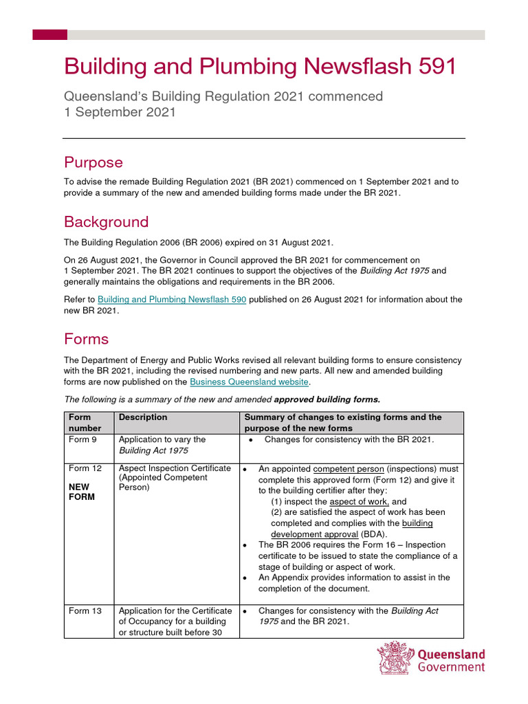 1 September 2021. The BR 2021 continues to support the objectives of the Building Act 1975 and