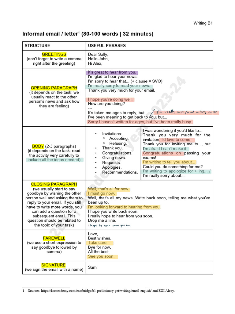 1 Sources: https://kseacademy.com/cambridge/b1-preliminary-pet/writing/email-english/ and EOI Alcoy.