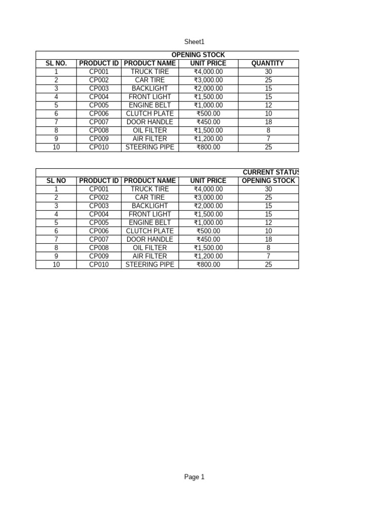 SL NO PRODUCT ID PRODUCT NAME UNIT PRICE OPENING STOCK