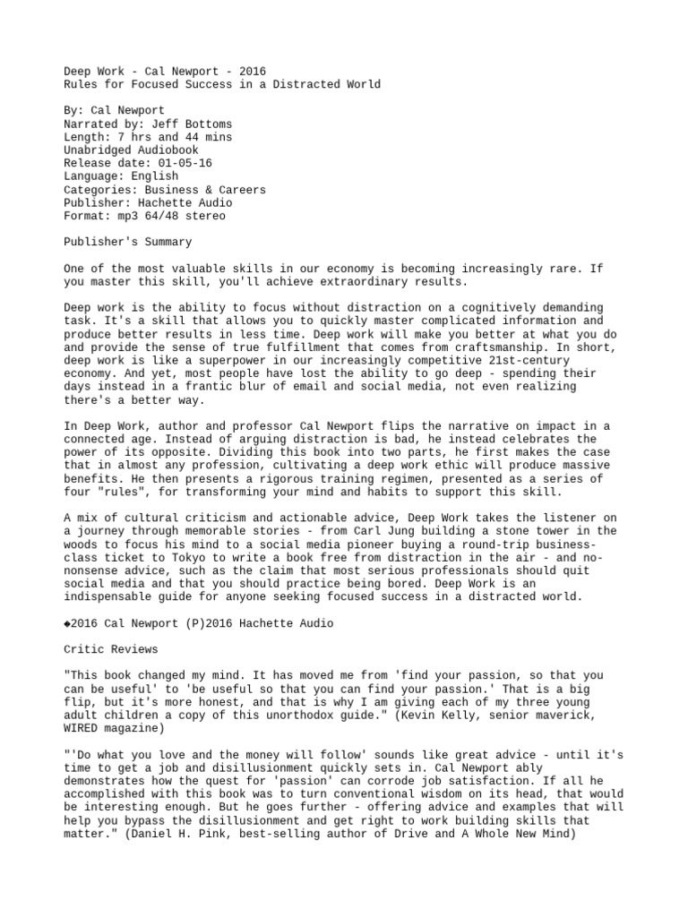 A mix of cultural criticism and actionable advice, Deep Work takes the listener on