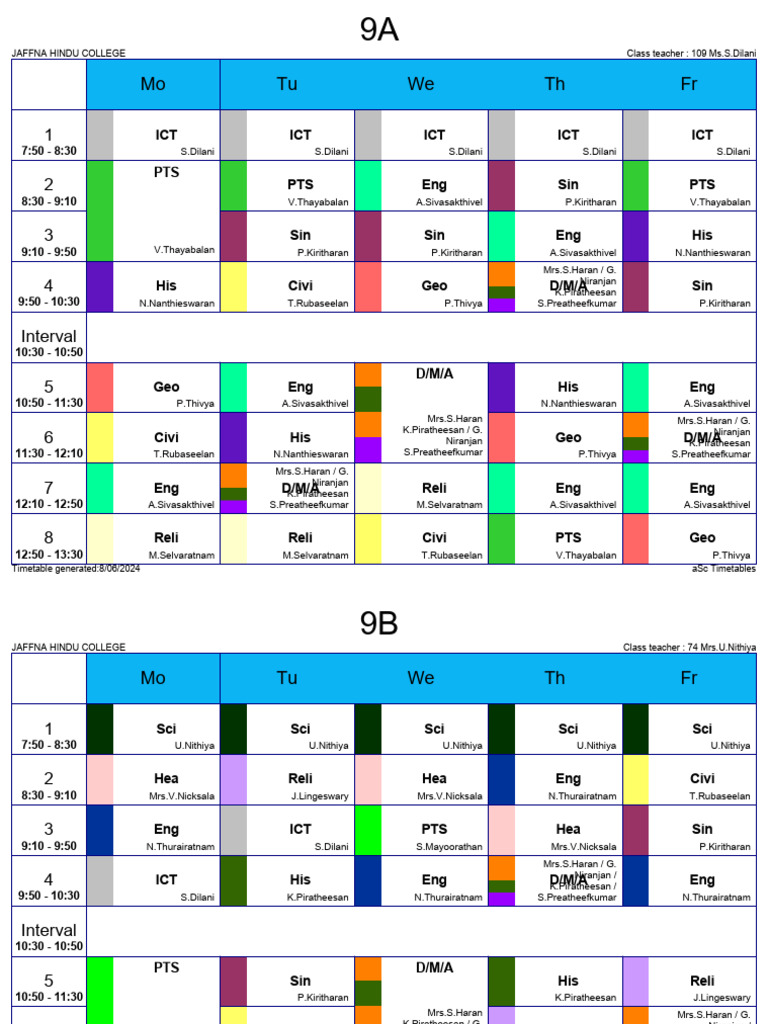 8:30 - 9:10 J.Lingeswary P.Kiritharan P..Thugeev Niranjan / Mrs.S.Haran