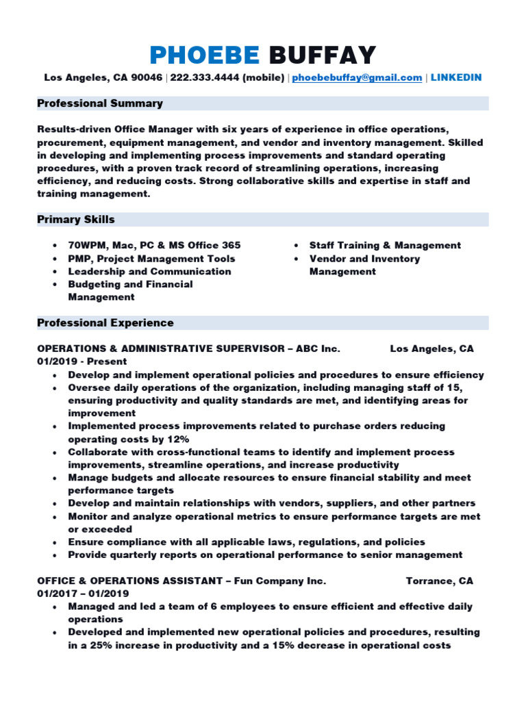 Los Angeles, CA 90046 | 222.333.4444 (mobile) | phoebebuffay@[Link] | LINKEDIN