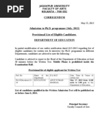 Date of Publication of Provisional Merit List