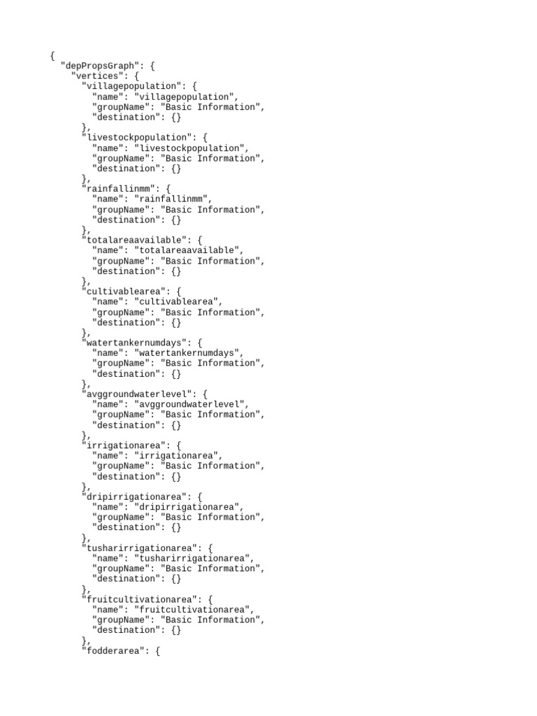 "depPropsGraph": { "vertices": { "villagepopulation": { "name": "villagepopulation", "groupName": "Basic Information", "destination": {} }, "livestockpopulation": { "name": "livestockpopulation", "groupName": "Basic Information", "destination": {} }, "rainfallinmm": { "name": "rainfallinmm", "groupName": "Basic Information", "destination": {} }, "totalareaavailable": { "name": "totalareaavailable", "groupName": "Basic Information", "destination": {} }, "cultivablearea": { "name": "cultivablearea", "groupName": "Basic Information", "destination": {} }, "watertankernumdays": { "name": "watertankernumdays", "groupName": "Basic Information", "destination": {} }, "avggroundwaterlevel": { "name": "avggroundwaterlevel", "groupName": "Basic Information", "destination": {} }, "irrigationarea": { "name": "irrigationarea", "groupName": "Basic Information", "destination": {} }, "dripirrigationarea": { "name": "dripirrigationarea", "groupName": "Basic Information", "destination": {} }, "tusharirrigationarea": { "name": "tusharirrigationarea", "groupName": "Basic Information", "destination": {} }, "fruitcultivationarea": { "name": "fruitcultivationarea", "groupName": "Basic Information", "destination": {} }, "fodderarea": { "name": "fodderarea", "groupName": "Basic Information", "destination": {}},"kharifseasonarea": { "name": "kharifseasonarea", "groupName": "Basic Information", "destination": {}},"rabiseasonarea": { "name": "rabiseasonarea", "groupName": "Basic Information", "destination": {}},"summerseasonarea": { "name": "summerseasonarea", "groupName": "Basic Information", "destination": {}},"treeplantationarea": { "name": "treeplantationarea", "groupName": "Basic Information", "destination": {}},"cropchoicearea": { "name": "cropchoicearea", "groupName": "Basic Information", "destination": {}},"cropdensity": { "name": "cropdensity", "groupName": "Basic Information", "destination": {}},"wastedwaterrainfall": { "name": "wastedwaterrainfall", "groupName": "Basic Information", "destination": {}},"waterstorageinsoil": { "name": "waterstorageinsoil", "groupName": "Basic Information", "destination": {}},"reqdrinkingwater": { "name": "reqdrinkingwater", "groupName": "Basic Information", "destination": { "type": "" }, "makeVisibleByValues": {}},"reqwaterkharif": { "name": "reqwaterkharif", "groupName": "Basic Information", "destination": {}},"storedwaterkharif": { "name": "storedwaterkharif", "groupName": "Basic Information", "destination": {} }, "extrawaterkharifseasonend": { "name": "extrawaterkharifseasonend", "groupName": "Basic Information", "destination": {} }, "waterwastedinevaporation": { "name": "waterwastedinevaporation", "groupName": "Basic Information", "destination": { "type": "" }, "makeVisibleByValues": {} }, "reqwaterrabisummer": { "name": "reqwaterrabisummer", "groupName": "Basic Information", "destination": {} }, "availablewaterrabisummerend": { "name": "availablewaterrabisummerend", "groupName": "Basic Information", "destination": {} }, "waterindexrabi": { "name": "waterindexrabi", "groupName": "Basic Information", "destination": {} }, "state": { "name": "state", "groupName": "Basic Information", "destination": {} }, "district": { "name": "district", "groupName": "Basic Information", "destination": { "type": "" }, "makeVisibleByValues": {} }, "taluka": { "name": "taluka", "groupName": "Basic Information", "destination": { "type": "" }, "makeVisibleByValues": {} }},"edges": [ { "fromNodeName": "villagepopulation", "toNodeName": "livestockpopulationt", "properties": {} },{ "fromNodeName": "livestockpopulation", "toNodeName": "totalareaavailable", "properties": {}},{ "fromNodeName": "totalareaavailable", "toNodeName": "cultivablearea", "properties": {}},{ "fromNodeName": "cultivablearea", "toNodeName": "watertankernumdays", "properties": {}},{ "fromNodeName": "watertankernumdays", "toNodeName": "avggroundwaterlevel", "properties": {}},{ "fromNodeName": "avggroundwaterlevel", "toNodeName": "irrigationarea", "properties": {}},{ "fromNodeName": "irrigationarea", "toNodeName": "dripirrigationarea", "properties": {}},{ "fromNodeName": "dripirrigationarea", "toNodeName": "availablewaterrainfall", "properties": {}},{ "fromNodeName": "availablewaterrainfall", "toNodeName": "tusharirrigationarea", "properties": {}},{ "fromNodeName": "tusharirrigationarea", "toNodeName": "fruitcultivationarea", "properties": {}},{ "fromNodeName": "fruitcultivationarea", "toNodeName": "fodderarea", "properties": { "formula":[ "{kharifseasonarea}", "+", "{rabiseasonarea}", "+", "{summerseasonarea"
