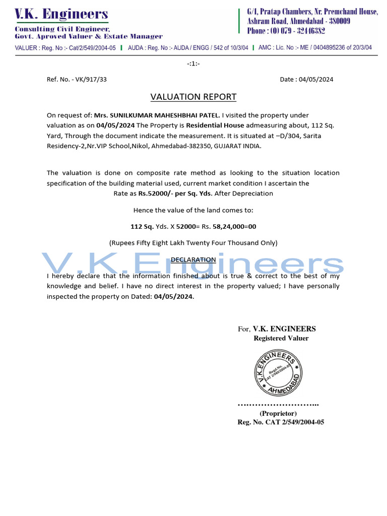 On request of: Mrs. SUNILKUMAR MAHESHBHAI PATEL. I visited the property under