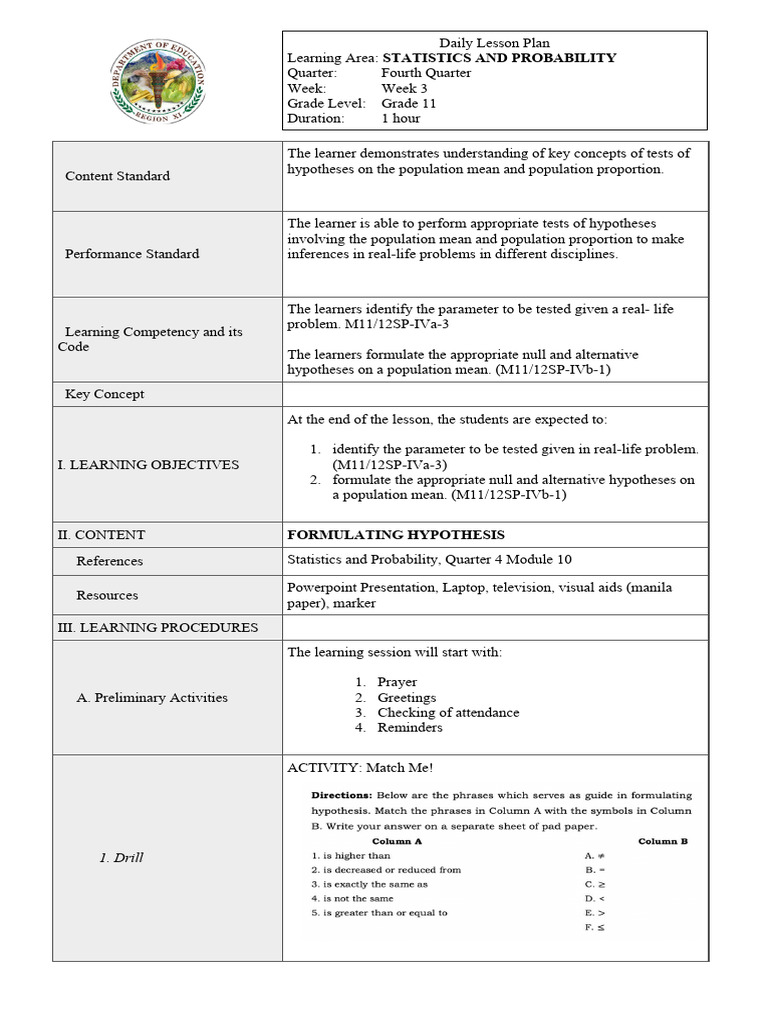 hypotheses on a population mean. (M11/12SP-IVb-1)