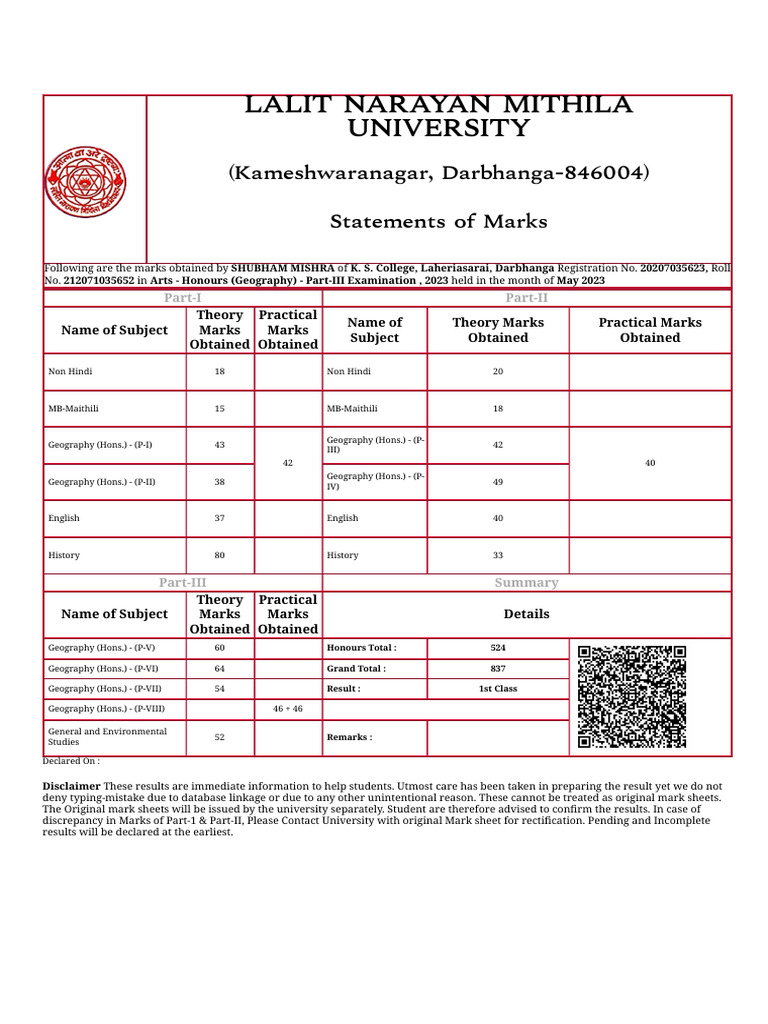 Following are the marks obtained by SHUBHAM MISHRA of K. S. College, Laheriasarai, Darbhanga Registration No. 20207035623, Roll