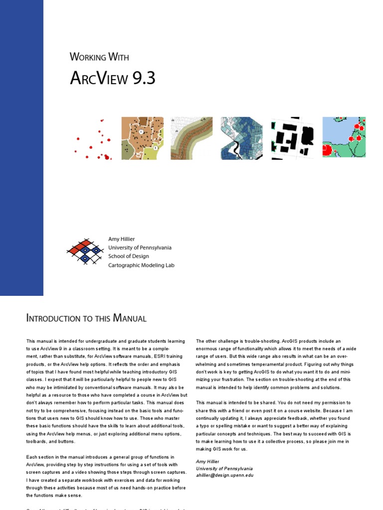 The other challenge is trouble-shooting. ArcGIS products include an enormous range of functionality which allows it to meet the needs of a wide range of users. But this wide range also results in what can be an overwhelming and sometimes temperamental product. Figuring out why things dont work is key to getting ArcGIS to do what you want it to do and minimizing your frustration. The section on trouble-shooting at the end of this manual is intended to help identify common problems and solutions. This manual is intended to be shared. You do not need my permission to share this with a friend or even post it on a course website. Because I am continually updating it, I always appreciate feedback, whether you found a typo or spelling mistake or want to suggest a better way of explaining particular concepts and techniques. The best way to succeed with GIS is to make learning how to use it a collective process, so please join me in making GIS work for us.