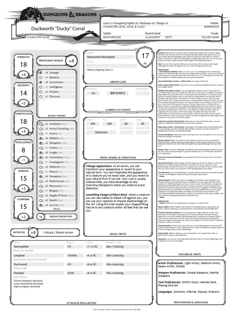 This character sheet was generated by Aurora, a character builder for Dungeons & Dragons 5th edition.