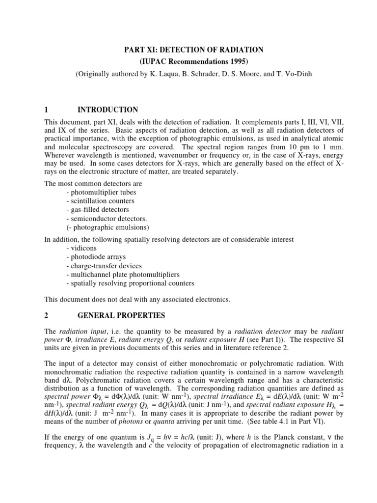 This document, part XI, deals with the detection of radiation. It complements parts I, III, VI, VII,