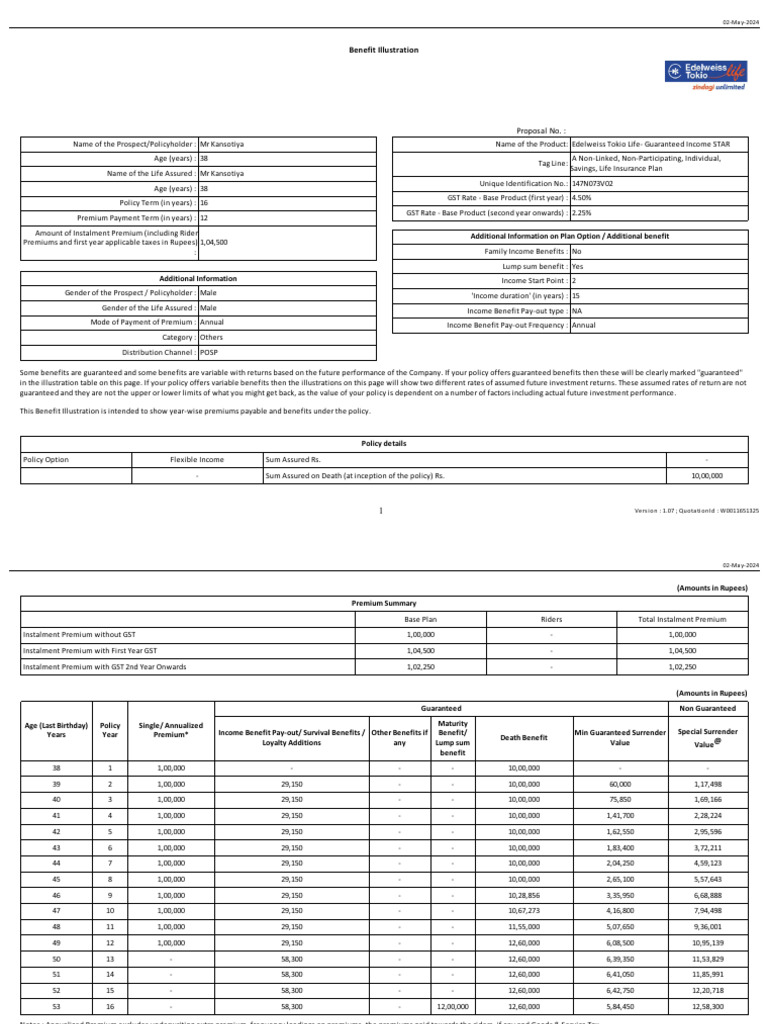 Name of the Prospect/Policyholder : Mr Kansotiya Name of the Product: Edelweiss Tokio Life- Guaranteed Income STAR