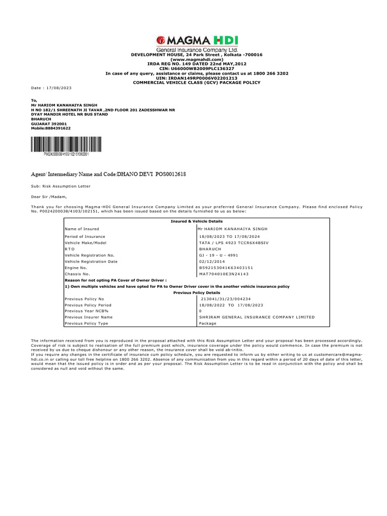 Thank you for choosing Magma-HDI General Insurance Company Limited as your preferred General Insurance Company. Please find enclosed Policy